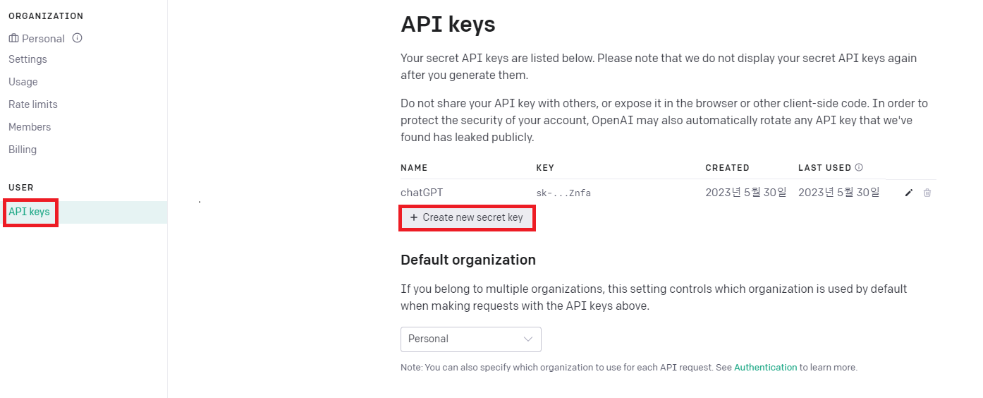 그리고 아래 사진과 같이 좌측의 API Keys에 들어간 후 Create new secret key 버튼을 누르면 API Key가 발급된다.