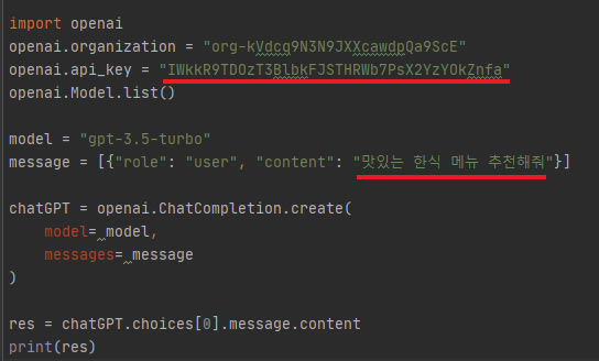 다음으로 python으로 코드를 작성하면 된다. 코드는 다음과 같다. 여기서 빨간줄 친 부분을 바꿔주면 된다. openai.api_key에는 발급받은 key를 넣어야한다.(아래 코드에는 임의로 넣었음). 그리고 message의 content 부분에 질문할 내용을 쓰면 된다. 질문할 내용은 실제 사용자에게 input을 받게할 수도 있고 이렇게 직접 넣을 수도 있다. 그리고 코드를 실행하고 조금 기다리면 chatGPT에게 답변을 받을 수 있다.