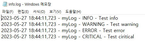 위 코드를 실행할 경우 info.log 파일에 로그가 남는 것을 확인할 수 있습니다. python 코드를 작성하면서 로그를 남기고 싶을때에 각 레벨에 맞는 로그 기록 함수를 사용하면 됩니다.