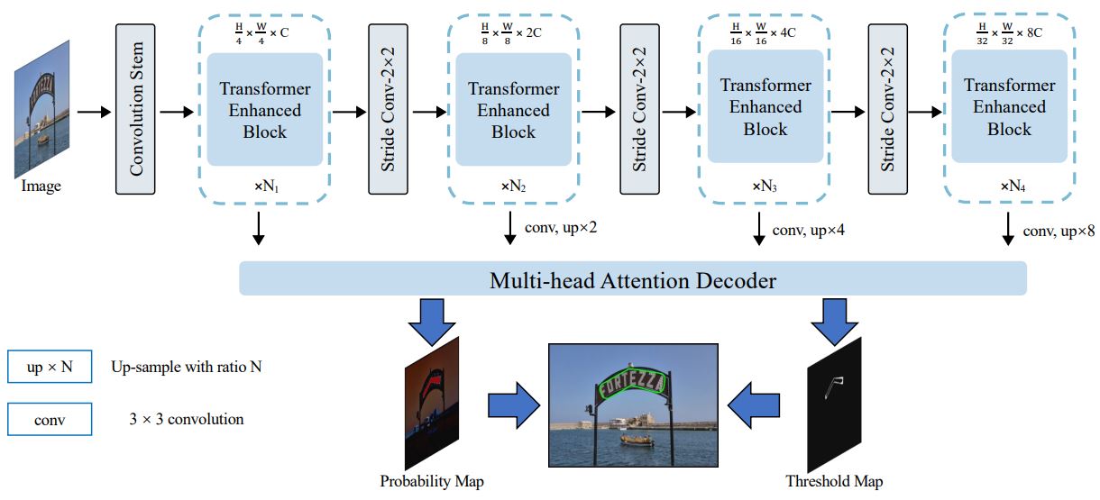 이 논문에서 제안하는 DPTNet 모델의 아키텍처는 그림 1과 같다. 먼저 이미지가 들어오면 FPN을 통해서 multi-level feature를 추출한다. 그리고 추출된 feature를 up-sampling해서 같은 scale로 만들고, contextual feature를 추출하기 위해 multi-head attention을 적용한다. 그런 다음 feature는 probability map과 threshold map을 만드는데 사용된다.