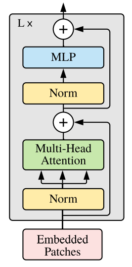 Vision Transformer는 이미지를 고정된 크기(16x16)의 패치로 분할하고 이 패치들을 input으로 사용하게 된다. 일반적인 Transformer는 1D sequence 데이터를 입력으로 받는다. 따라서 16x16으로 분할된 패치들은 1-Dimension으로 변환한다. 2D 이미지를 처리하기 위해 이미지 x ∈ RH×W×C를 Flatten 2D 패치 xp ∈ RN×(P 2 ·C) sequence로 재구성하고, 여기서 (H, W)는 원본 이미지의 해상도이고 C는 채널 수, (P, P)는 이미지 패치의 해상도이고 N = HW/P2는 결과 패치 수이며, 이는 Transformer의 입력 시퀀스 길이로도 사용된다. Transformer는 일정한 latent 벡터 크기를 사용하므로 패치를 평면화하고 학습 가능한 Linear Projection을 사용하여 D차원에 매핑한다. 이 Projection의 출력을 패치 임베딩이라고 한다. 그리고 Classification 작업에 사용될 Classification Token 벡터가 추가되어진다. 각각의 패치에 대해서는 이미지에서 차지하는 위치 정보가 패치별로 포함되어 임베딩된다. 이렇게 임베딩된 Vector Sequence를 Transformer Encoder에 넣는다.